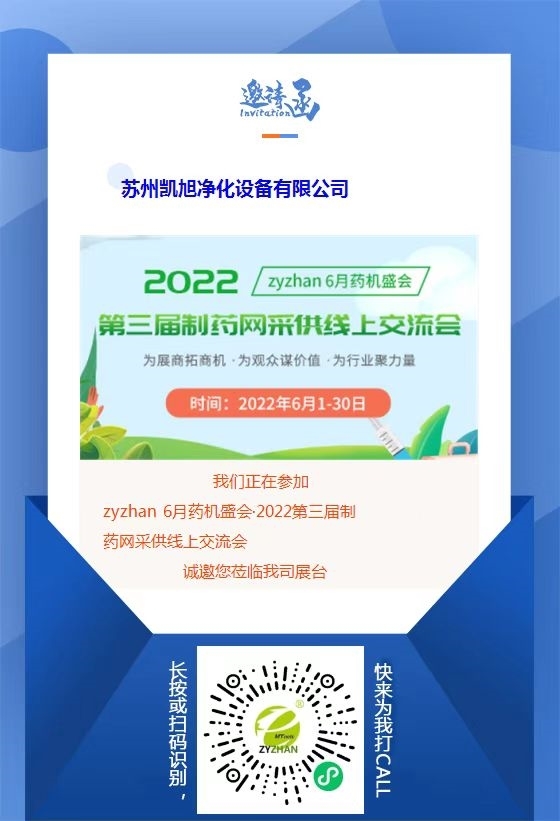 zyzhan 6月药机盛会——2022第三届制药网采供线上交流会(简称“zyzhan 6月药机盛会")将在2022年6月1日-6月30日举行。今年的展会,设有原料药机械、制剂机械、饮片机械、制药 用水/气设备、药品包装机械、仪器仪表、其他制药机械等7个展区。届时,专业水处理设备服务商——苏州凯旭净化设备有限公司(以下简称:苏州凯旭)也将出席展会,为大家提供更多新的水处理工程设备及服务解决方案。