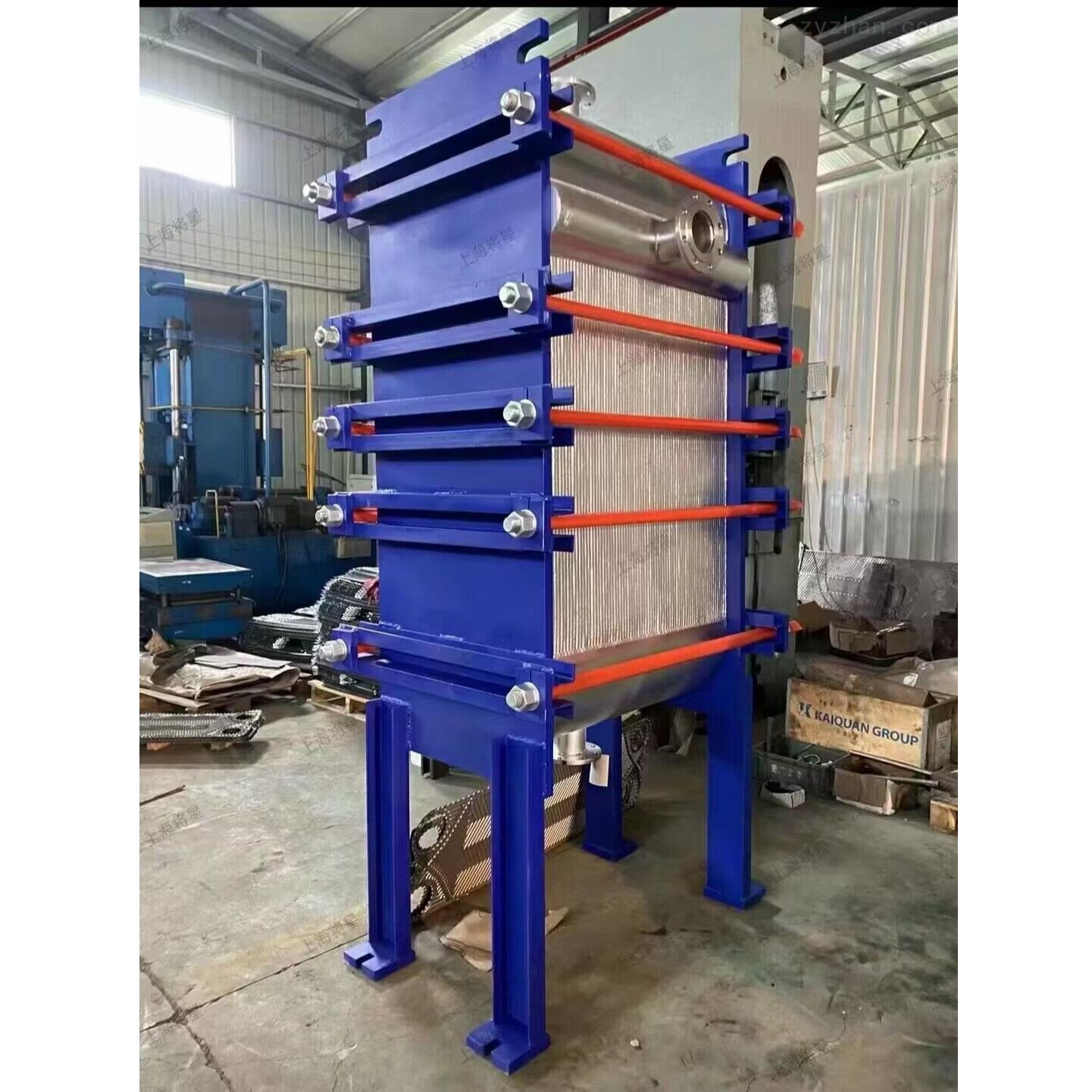 NN板式热交换器是由一组波纹金属板组成,上有四个角孔,供传热的两种液体通过。金属板片安装在一个侧面有固定板上导杆和活动压紧板的框架内,并用夹紧螺栓夹紧。板片上装有密封垫片,将流体通道密封并且引导流体交替地流至各自的通道内,形成热交换。波纹板提高了湍流程度且锅板形成许多支承点,可以承受介质间的压力差。